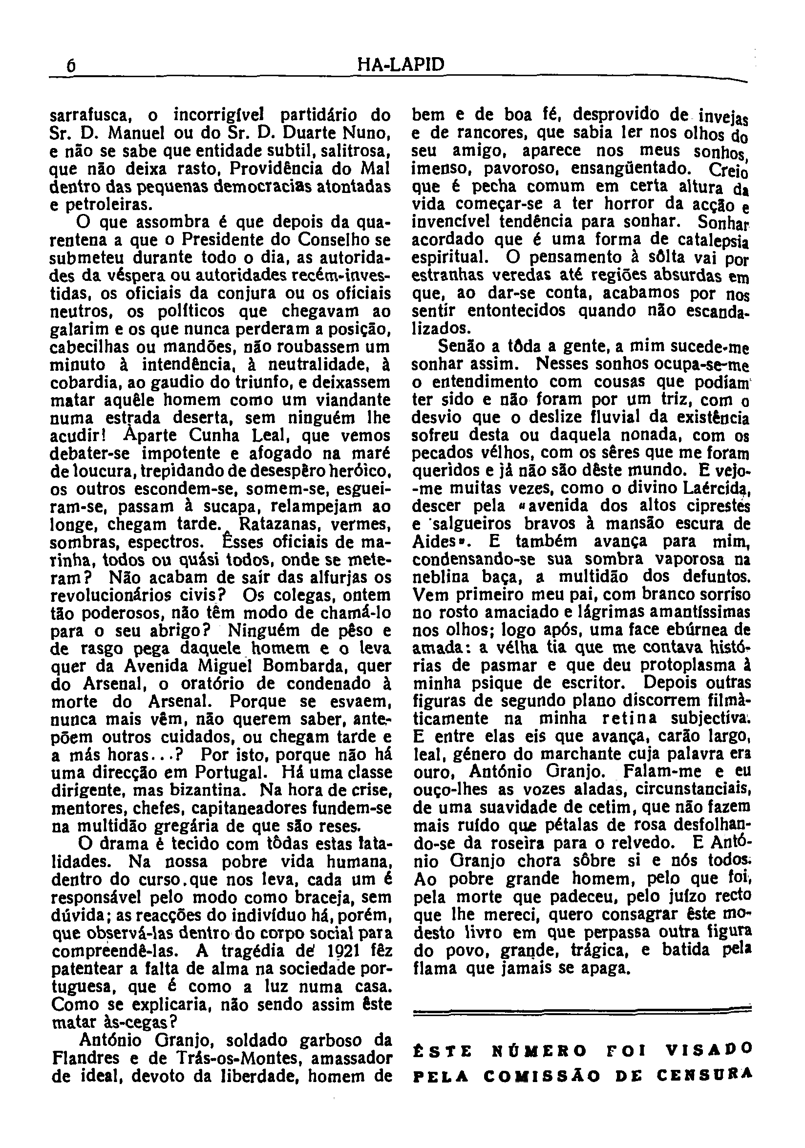 6 HA-LAPID ========================================== sarrafusca, o incorrigivel partidário do Sr. D. Manuel ou do Sr. D. Duarte Nuno, e não se sabe que entidade subtil, salitrosa, que não deixa rasto, Providência do Mal dentro das pequenas democracias atontadas e petroleiras. O que assombra é que depois da qua- rentena a que o Presidente do Conselho se submeteu durante todo o dia, as autorida- des da véspera ou autoridades recém-inves- tidas, os oficiais da coniura ou os oficiais neutros, os politicos que chegavam ao galarim e os que nunca perderam a posição, cabecilhas ou mandões, não roubassem um minuto à intendência, à neutralidade, à cobardia, ao gaudio do triunfo, e deixassem matar aquêle homem como um viandante numa estrada deserta, sem ninguém lhe acudir! Àparte Cunha Leal, que vemos debater-se impotente e afogado na maré de loucura, trepidando de desespero heróico. os outros escondem-se, somem-se, esguei- ram-se, passam à sucapa, relampeiam ao longe, chegam tarde. Ratazanas, vermes, sombras, espectros. Êsses oficiais de ma- rinha, todos ou quási todos, onde se mete- ram? Não acabam de saír das alfurjas os revolucionários civis? Os colegas, ontem tão poderosos, não têm modo de chamá-lo para o seu abrigo? Ninguém de pêso e de rasgo pega daquele homem e o leva quer da Avenida Miguel Bombarda, quer do Arsenal, o oratório de condenado à morte do Arsenal. Porque se esvaem, nunca mais vêm, não querem saber, ante- põem outros cuidados, ou chegam tarde e a más horas...? Por isto. porque não há uma direcção em Portugal. Há uma classe dirigente, mas bizantina. Na hora de crise, mentores, chefes, capitaneadores fundem-se na multidão gregária de que são reses. O drama e tecido com tôdas estas fata- lidades. Na nossa pobre vida humana, dentro do curso que nos leva, cada um é responsável pelo modo como braceía, sem dúvida; as reacções do indivíduo há, porém, que observa-las dentro do corpo social para compreende-las. A tragédia de 1921 fêz patentear a falta de alma na sociedade por- tuguesa, que é como a luz numa casa. Como se explicaria. não sendo assim éste matar as-cegas? António Granjo, soldado garboso da Flandres e de Trás-os-Montes, amassador de ideal, devoto da liberdade. homem de bem e de boa fé, desprovido de inveja; e de rancores, que sabia ler nos olhos do seu amigo, aparece nos meus sonhos imenso, Polvoroso, ensangüentado. Creio que e pecha comum em certa altura da vida começar-se a ter horror da acção e invencível tendência para sonhar. Sonhar, acordado que é uma forma de catalepsia espiritual. O pensamento à solta vai por estranhas veredas até regiões absurdas em que, ao dar-se conta, acabamos por nos sentir entontecidos quando não escanda- lizados. Senão a tôda a gente, a mim sucede-me sonhar assim. Nesses sonhos ocupa-se-me o entendimento com cousas que podiam ter sido e não foram por um triz, com o desvio que o deslize fluvial da existência sofreu desta ou daquela nonada, com os pecados vélhos, com os sêres que me foram queridos e já não são dêste mundo. E veio- -me muitas vezes, como o divino Laércída, descer pela "avenida dos altos ciprestés e salgueiros bravos à mansão escura de Aides". E também avança para mim, condensando-se sua sombra vaporosa na neblina baça, a multidão dos defuntos. Vem primeiro meu pai, com branco sorriso no rosto amaciado e lágrimas amantfssimas nos olhos; logo após, uma face ebúrnea de amada: a velha tia que me contava histo- rias de pasmar e que deu protoplasma à minha psique de escritor. Depois outras figuras de segundo plano díscorrem filmà- ticamente na minha retina subjectiva. E entre elas eis que avança, carão largo, leal, género do marchante cuja palavra era ouro, António Granjo. Falam-me e eu ouço-lhes as vozes aladas, circunstanciais, de uma suavidade de cetim, que não fazem mais ruido que pétalas de rosa desfolhan- do-se da roseira para o relvedo. E Antó- nio Granjo chora sôbre si e nós todos. Ao pobre grande homem, pelo que foi. pela morte que padeceu, pelo juizo recta que lhe mereci, quero consagrar éste mo- desto livro em que perpassa outra figura do povo, grande, trágica, e batida pela flama que jamais se apaga. ----------------------------------------- ESTE NUMERO FOI VISADO PELA COMISÃO DE CENSURA